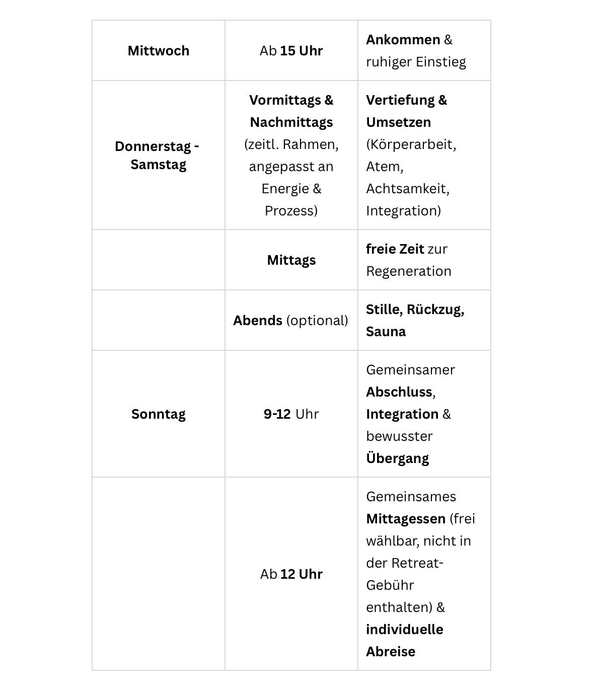 - Reflexion und Integration (Raum für Stillwerden, Sortieren, Nachspüren und das bewusste Mitnehmen in den Alltag)